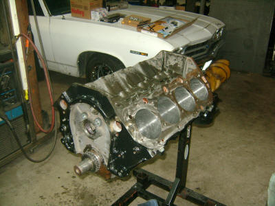 Bored out to 4.165 (4.125 + .040" = 4.165") with Keith Black KB160 .040 Hyper Pistons.  Compression ratio = 9.33:1