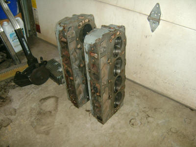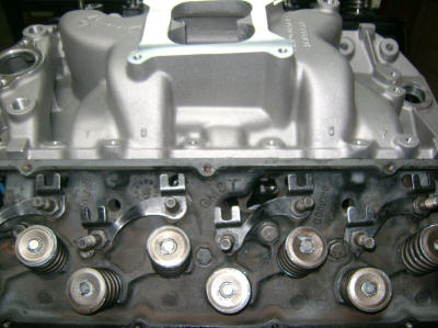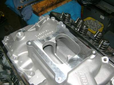 Heads were completely stripped apart and redone.  Comp Cams push rod guides and screw in studs.  Summit Racing intake installed and test fit.