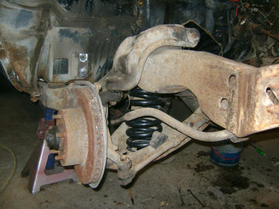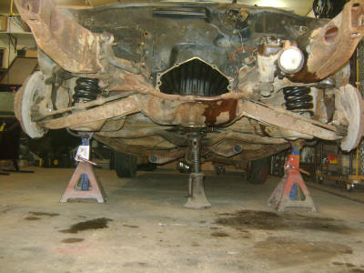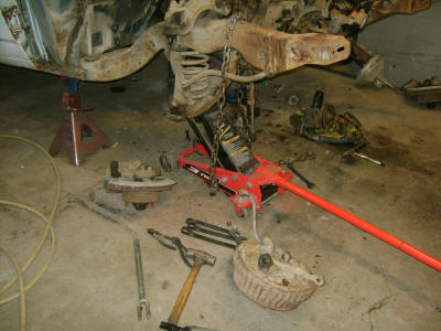 The motor is back out and in storage until the frame is blasted and completed.  After the motor came out it was time to change over the front end to disk brakes.  They are off a 72 Chevelle and will bolt right on.  I also installed Elgin 6330 matched springs which are for the 69 A-bodies with big blocks.  Let me tell you, they are one stiff spring.